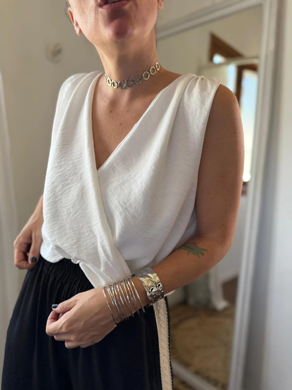 La Blusa Cruz es ese básico no tan básico que transforma cualquier look con su caída suave y su escote cruzado súper favorecedor. Femenina, versátil y con un toque chic francés, es perfecta para elevar desde un jean hasta un pantalón sastrero.