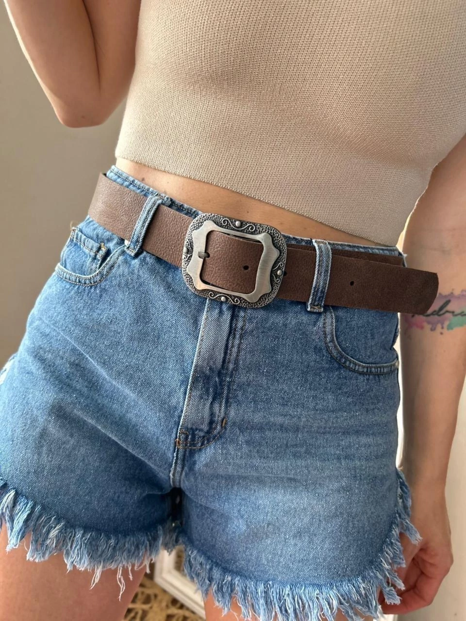 Cinturón de cuero con hebilla plateada en forma cuadrada con detalles grabados