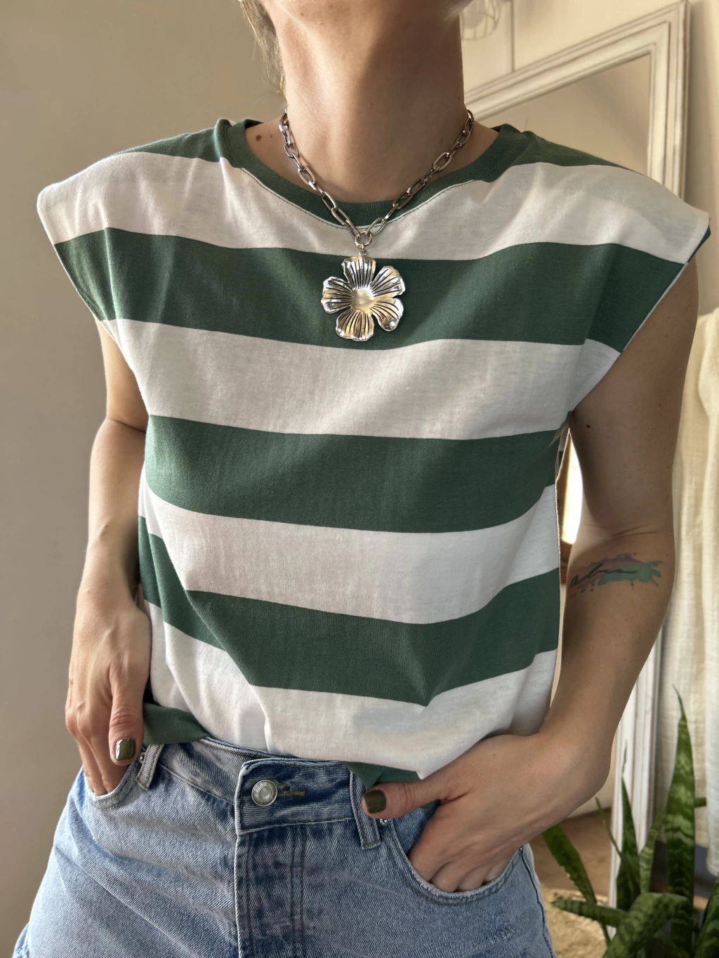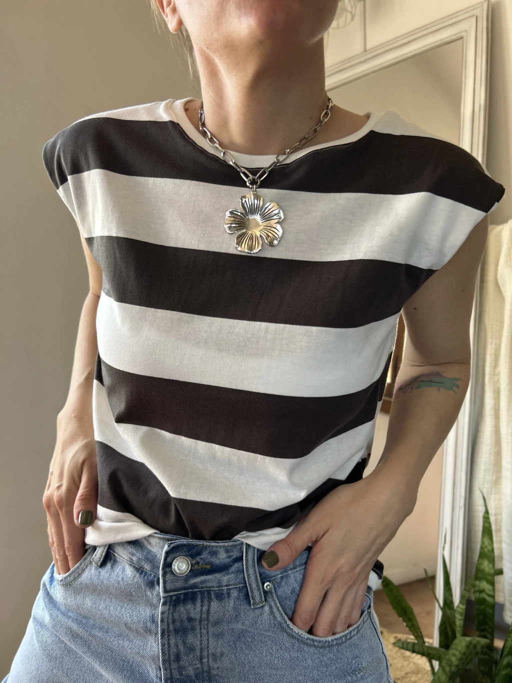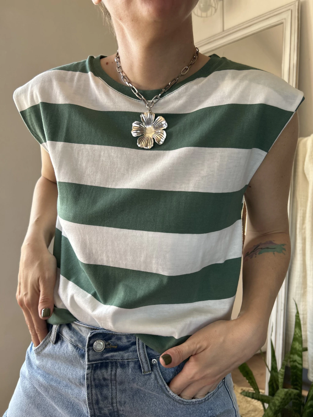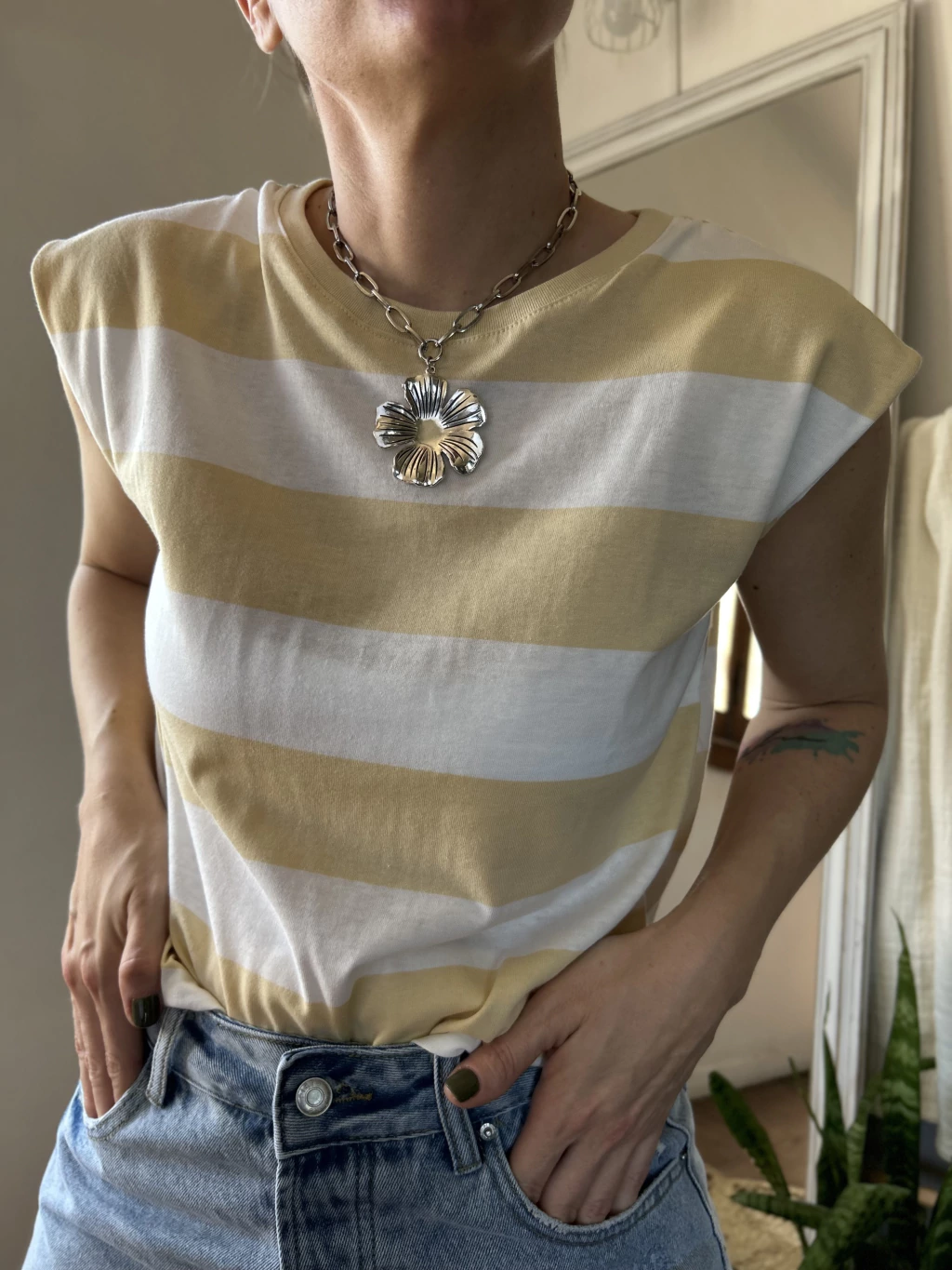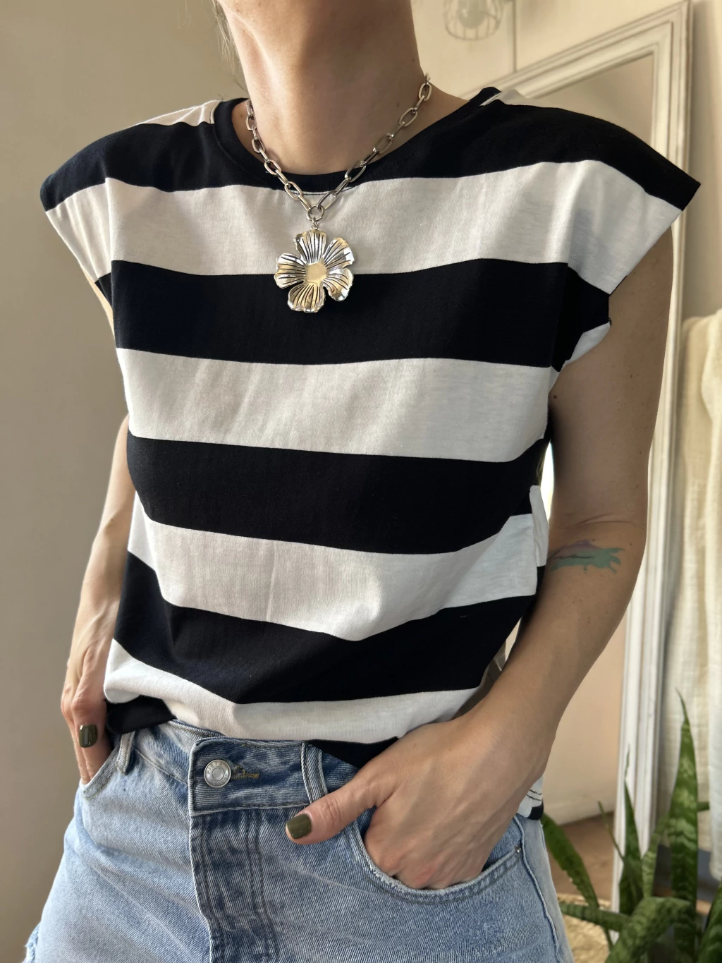 MUSCULOSA CUELLO REDONDO RAYADA DE ALGODON, EL CORTE DE SU MANGA SIMULA UNA SIMIL HOMBRERA.