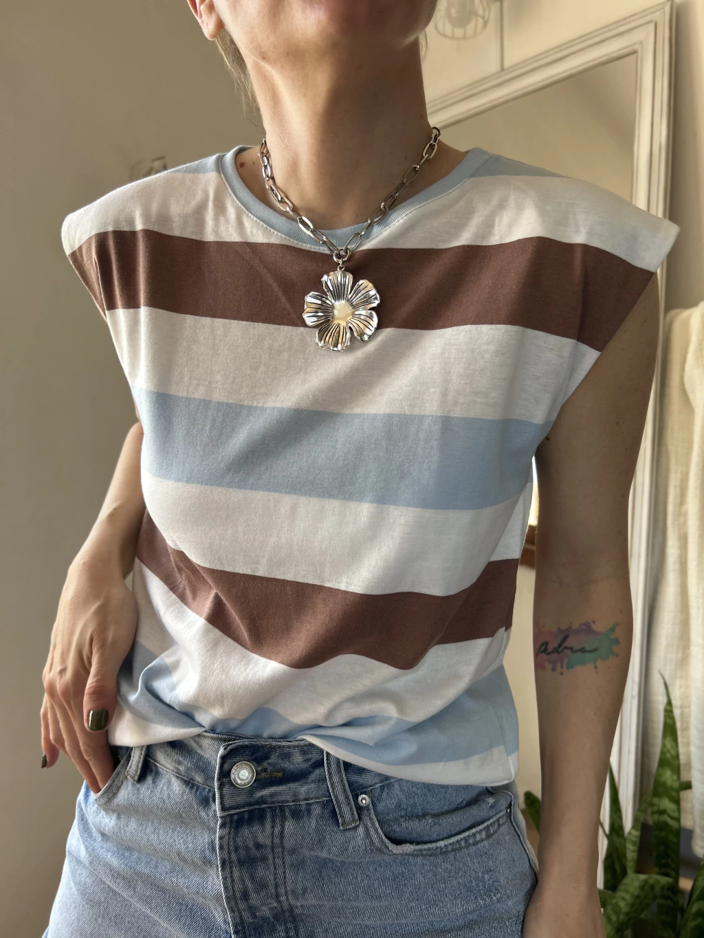 Nuestra musculosa con símil hombrera es el básico canchero que levanta cualquier look.