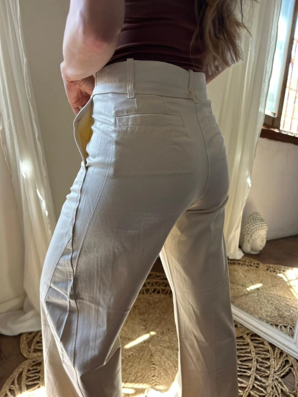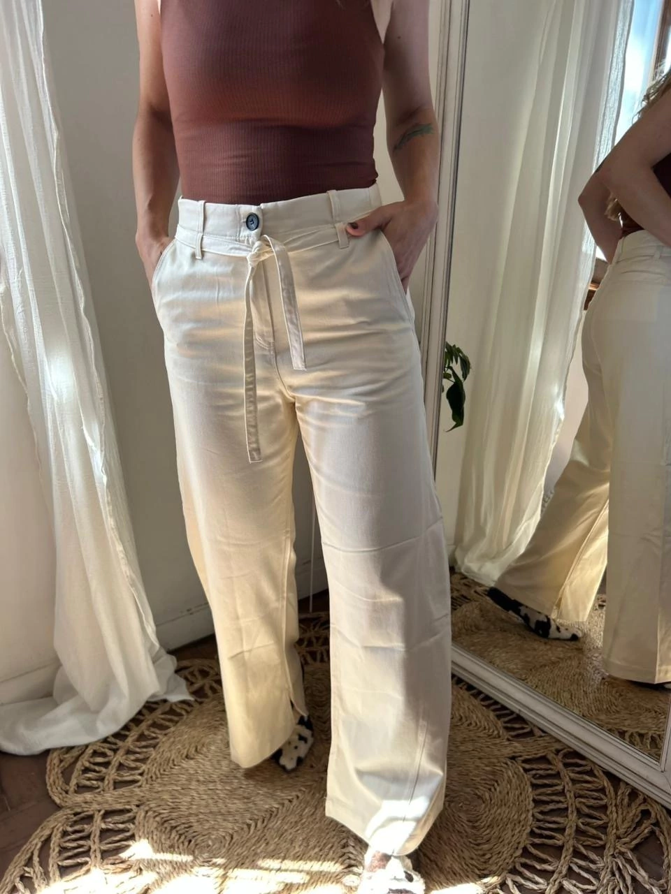 De corte wide leg, cuenta con bolsillos laterales, bolsillos ojal en la parte trasera y un lazo regulable en la cintura que le suma un detalle sutil y femenino. Su tono natural es ideal para combinar con básicos neutros o tops de color tierra, logrando un look sofisticado y relajado al mismo tiempo.