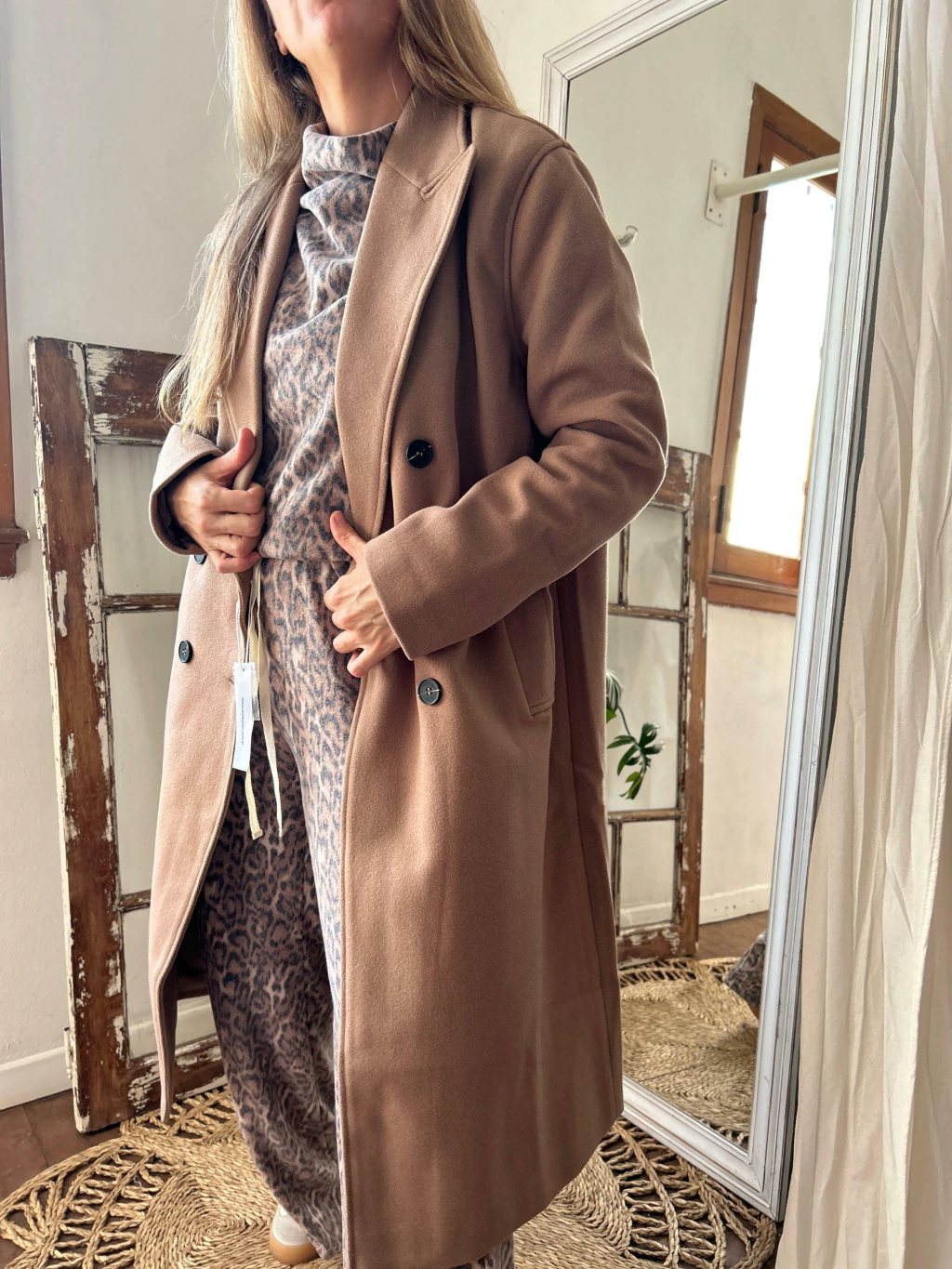 Tapado de paño forrado en su interior; con solapa para cruzar, 6 botones y bolsillos.